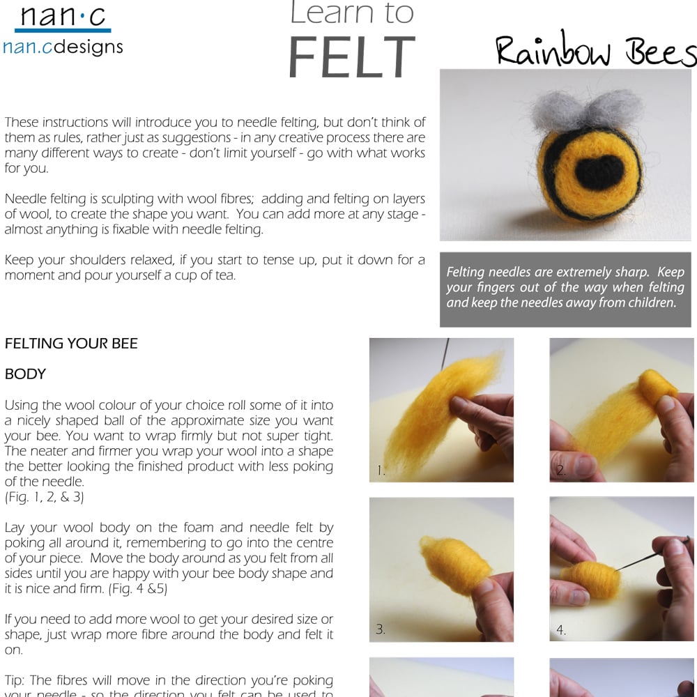 You will receive a link, via email, immediately for your digital download PDF file which includes nan.c designs' felting basics instructions, helpful tips, and step-by-step photos to make your own needle felted rainbow coloured bees. The pdf file will print nicely in full colour on regular 8.5 x 11 paper.